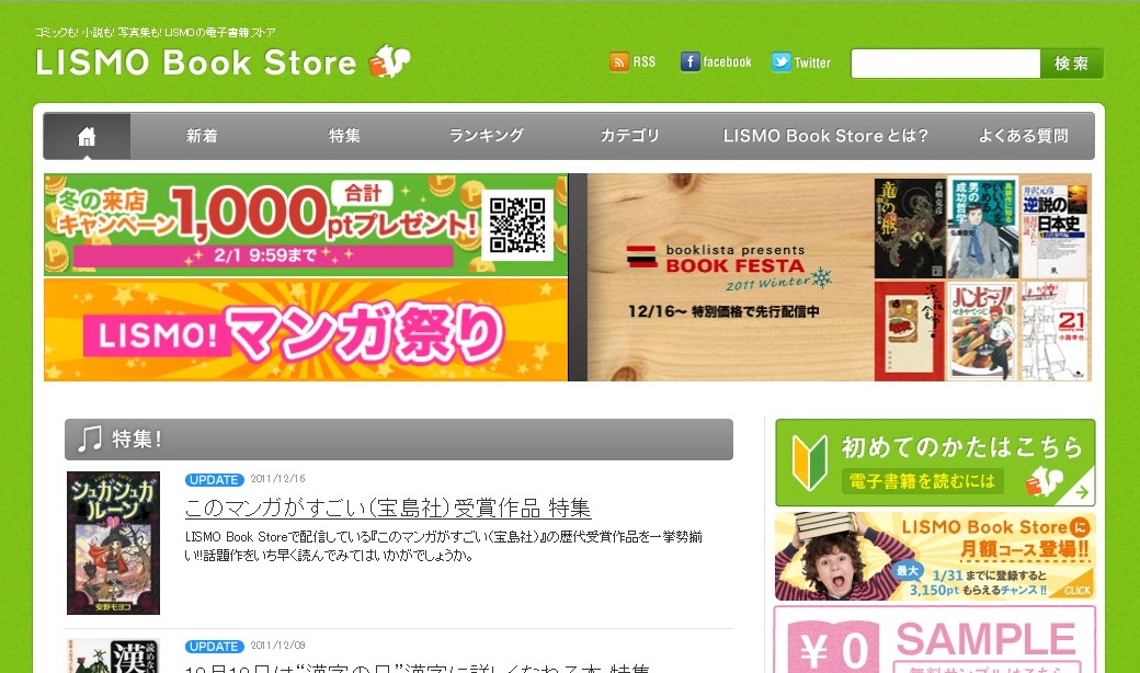 現在、「マンガ祭り」と同時に「もれなく最大1,000ptプレゼント・冬の来店キャンペーン」も実施しており、期間中にLISMO Book Storeにログインすると、1月あたり500円相当のポイントを入手できる。こちらは2月1日まで。