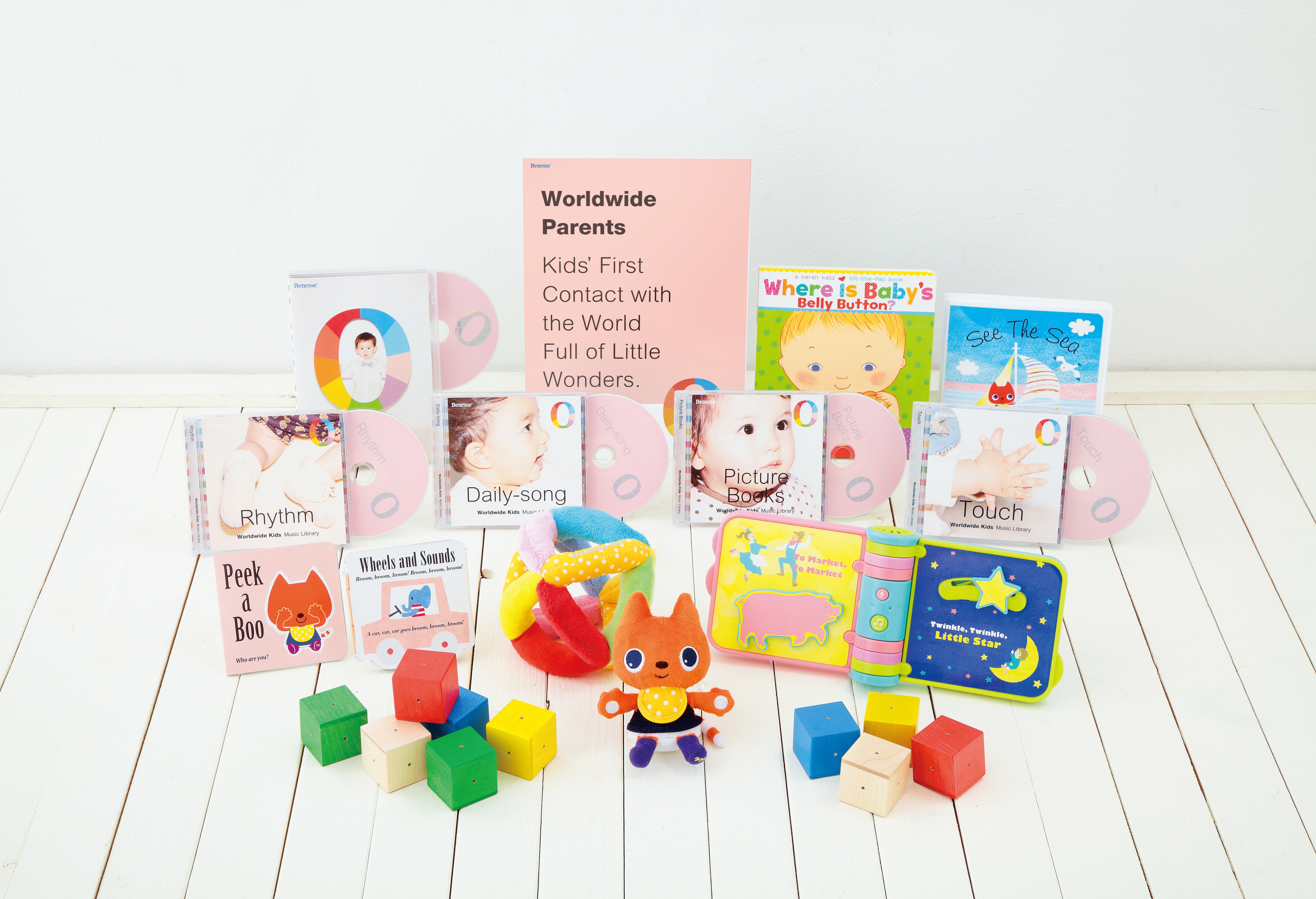 Stage0の教材は、CD、DVD、絵本、おもちゃ。CDは4枚ついていて、「Daily Songs」「Rhythm」「Touch」「Picture Books」とテーマ別に分かれているところが、ディズニーと違うところ。「Worldwide」のCDを聞いてしまうと、ディズニーのCDにまで"レトロ"を感じてしまう。「Daily Songs」の冒頭はこじゃれたカフェでかけていても違和感がないような感じで、おしゃれな雰囲気。「Picture Book」は、絵本と連動していて、読み聞かせ風のタイトルが入っているのも特徴的だ。